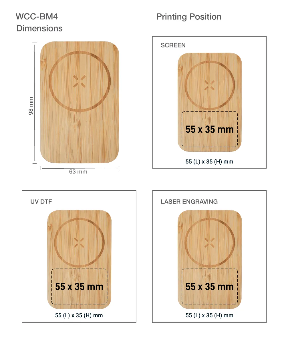 This charger offers multiple printing options for personalization, including Laser Engraving, UV DTF Printing, and Screen Printing—ideal for branding or custom designs.
