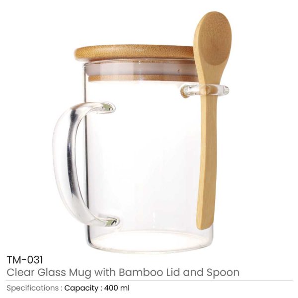 Clear glass mug with a bamboo lid and spoon, featuring a stylish and innovative combination of glass and bamboo materials. This promotional travel mug is crafted from durable glass and features a lid and spoon made from eco-friendly bamboo. The bamboo material on the lid of these mugs keeps your coffee or tea hot and away from a cool environment. These high-quality mugs are excellent for the winter season, but you can also use them in the summer season.