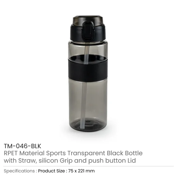 Eco-friendly Sports Bottles with Straw, 700ml, made from durable rPET material, are perfect for daily hydration needs. Featuring a transparent black body, secure push-button lid, comfortable silicon grip, and convenient straw, these bottles are reusable and sustainable. Ideal for gyms, outdoor activities, office use, and promotional giveaways across Dubai, Abu Dhabi, Sharjah, and the UAE.