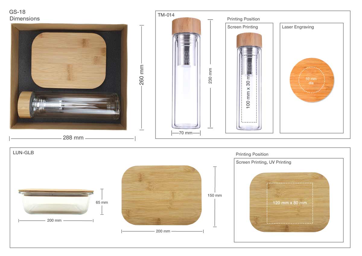 1. TM-014: Glass and Bamboo Flask | 2. LUN-GLB: Glass and Bamboo Lunch Box.