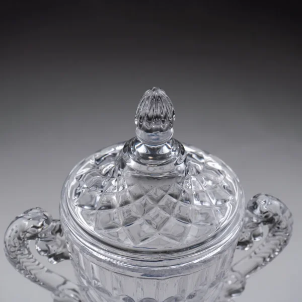 - Design: Large, clear cup with handles, mounted on a solid glass base