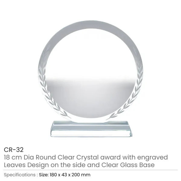 - Design: Elegant round clear crystal award with engraved leaf detailing