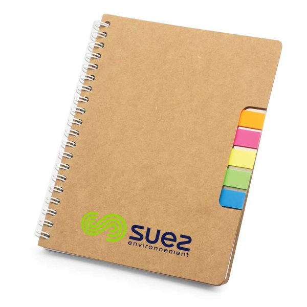 Spiral notebooks with sticky notes and pens are creatively customized notebooks. The cover of this notepad had crafted from 100% recycled and durable cardboard material. Thus, they are eco-friendly and durable spiral notebooks. This spiral notebook comprises two parts. One part contains colorful sticky notes and a cardboard pen with a pen holder. While the other part has note pages. Thus, it’s an excellent creative promotional item for you for the promotion of your company or brand. So, you can use these notebooks for multiple purposes. This cover is in light brown with a white spiral ring. However, the pen has a cardboard barrel with a white tip and clip. Thus, it’s a perfect corporate gift.