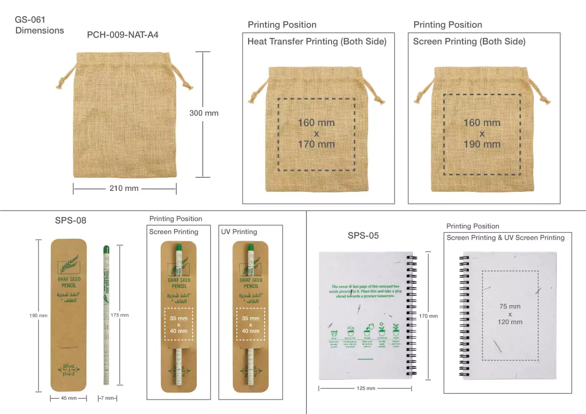 - Plantable Pencil (SKU: SPS-05): Made with Ghaf seeds, this pencil can be planted after use, allowing it to grow into a Ghaf tree.