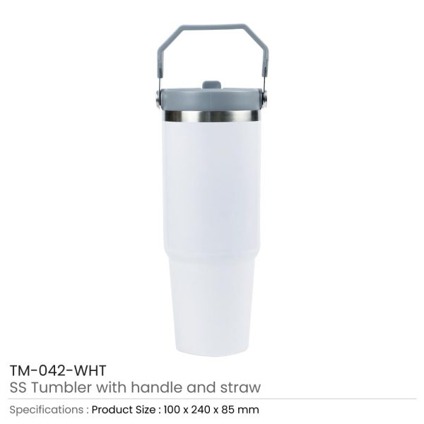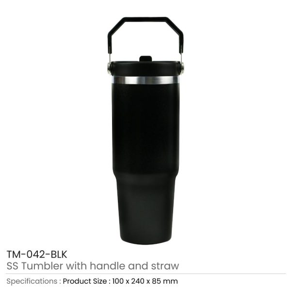 Tumbler in stainless steel double-wall vacuum insulated tumbler with flip-straw Lid and carry handle. The customized vacuum-insulated tumbler is ideal for keeping your beverage hot for hours. These tumblers are durable as they are made with premium quality, stainless steel material. They also come with a double wall design to maintain the freshness and taste of your drink.