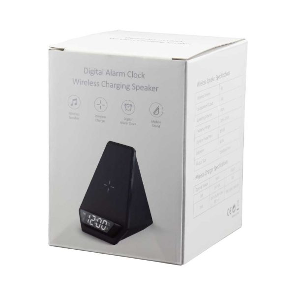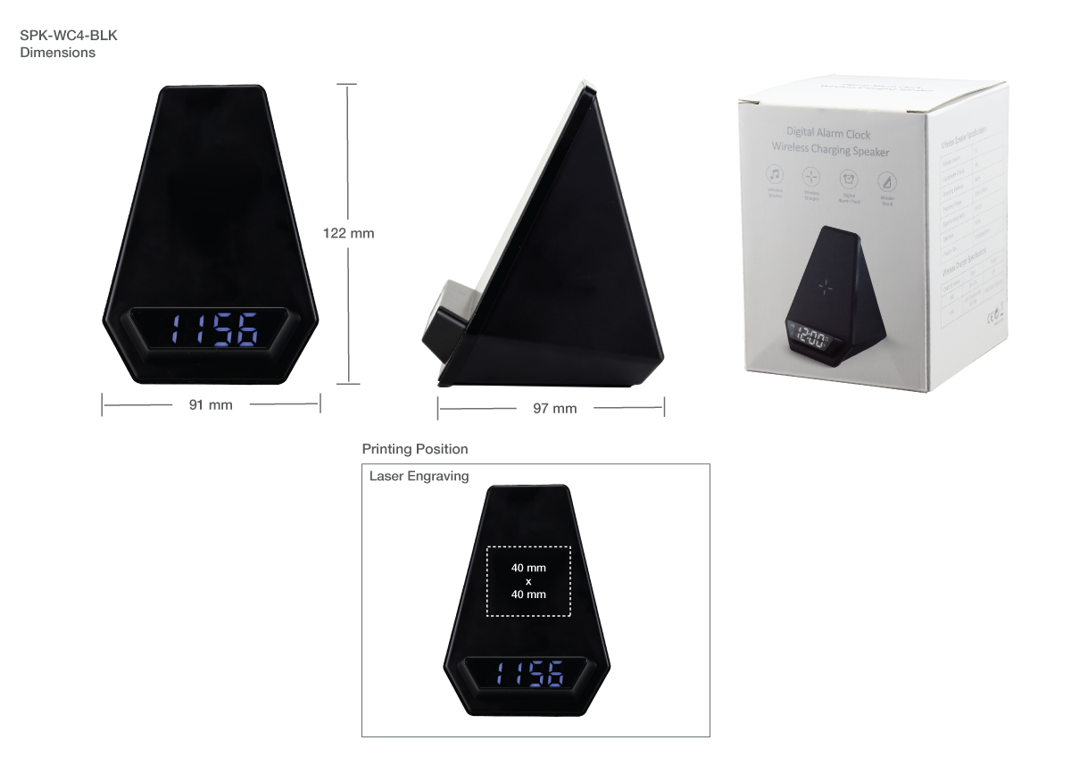 Multi-function wireless charger Bluetooth speaker with digital alarm Clock that is made from Black ABS Material with White LED Light for Light Up Logo Functions.