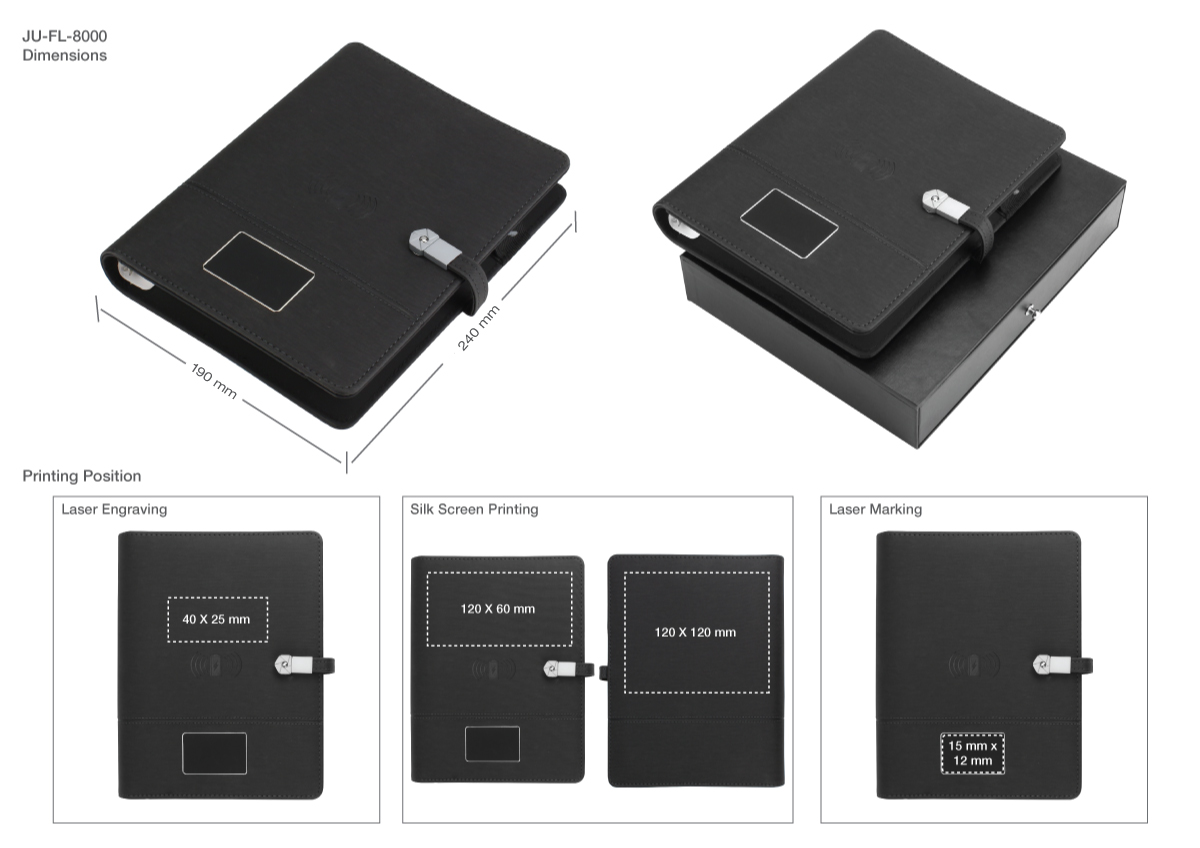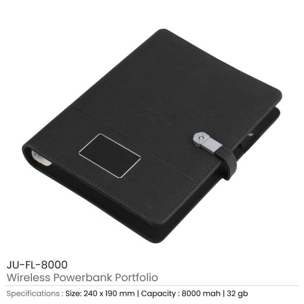 8000 mAh wireless power bank portfolio A5 size black color w/ light-up logo & 32GB USB in the black box.
