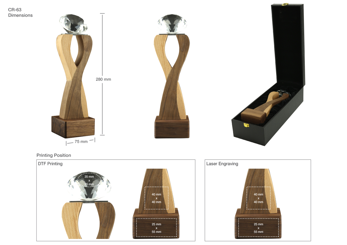 Wooden trophy with diamond-shaped crystal on top presented in the black hard-board box.