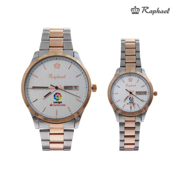 Ladies’ and gents’ watches are famous promotional watches from Raphael. These branded wristwatches had crafted with water-resistant stainless steel. So, it has a classy yet elegant appearance. The size of the ladies’ watch is 30 mm, while the size of the gent’s watch is 43mm. It has a silver chain with rust color parts in the middle. While the frame is also in rust color. Unlike the frame, its dial is white. However, its needles and markings are rust color. Thus, overall it’s a very stylish watch. Moreover, it has two small areas on the dial. One is used to display the date while the other displays the day.